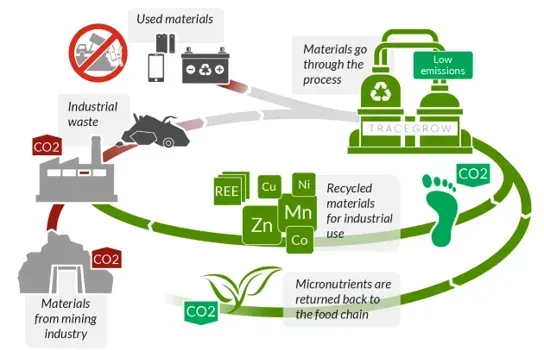 Our RETRACER technology and groundbreaking process facilitate the recovery of valuable trace elements, such as manganese and zinc, from recycled batteries and industrial side streams. From these reclaimed elements, we manufacture low-carbon footprint foliar fertilisers for agriculture and raw materials for industrial use. Our production has minimal biodiversity impact.