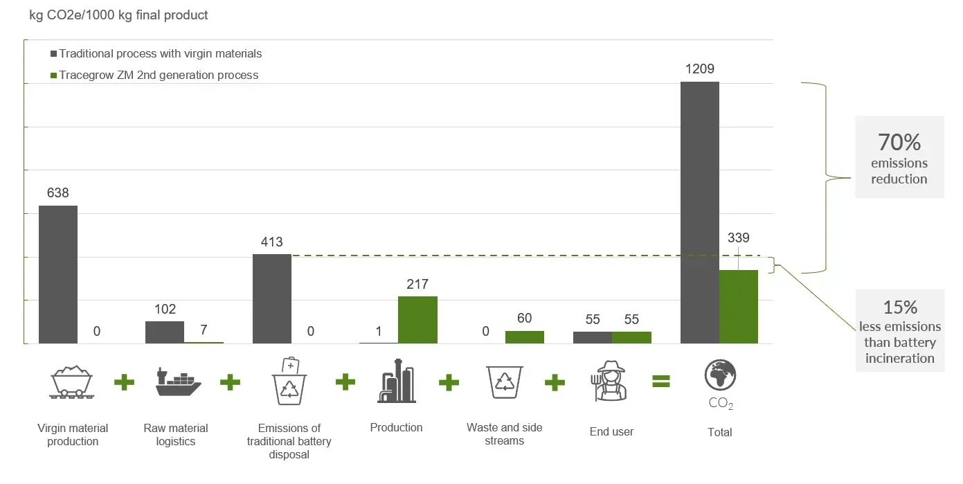 Compared to traditional practices, our process achieves an impressive 70% reduction in overall emissions. These practices involve mining virgin raw materials from distant sources, transporting them over long distances, and recycling used alkaline batteries through conventional methods.