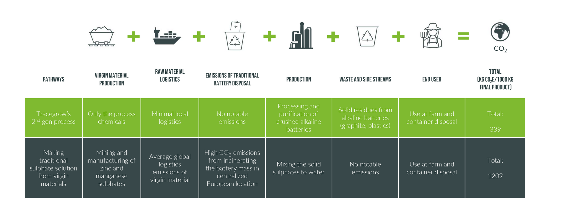 Tuotantolaitoksemme pystyy tuottamaan vuodessa jopa 10 milj. litraa nestemäisiä lannoitteita maatalouden käyttöön erittäin pienillä päästöillä. Teknologiamme avulla saamme alkaliparistojen raaka-aineista jopa 90% talteen, kun taas perinteisillä paristojen kierrätysmenetelmillä saadaan talteen vain 50%.