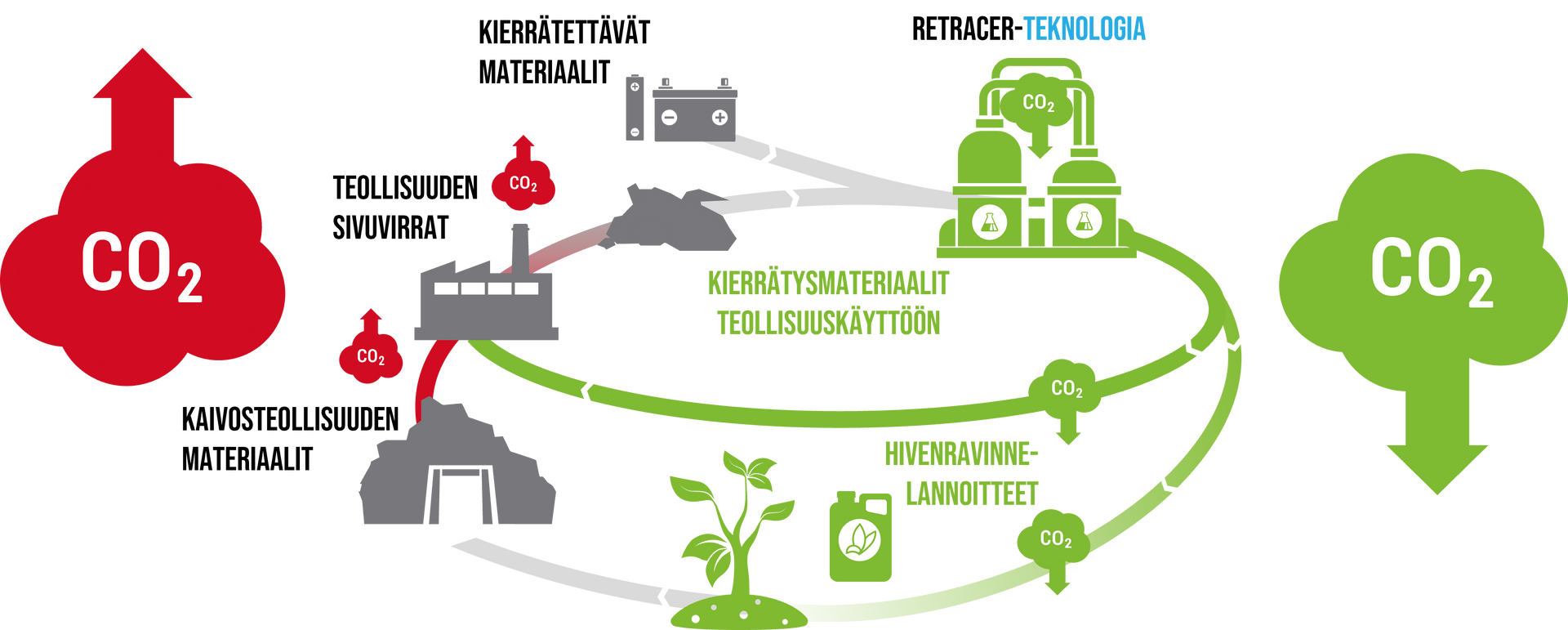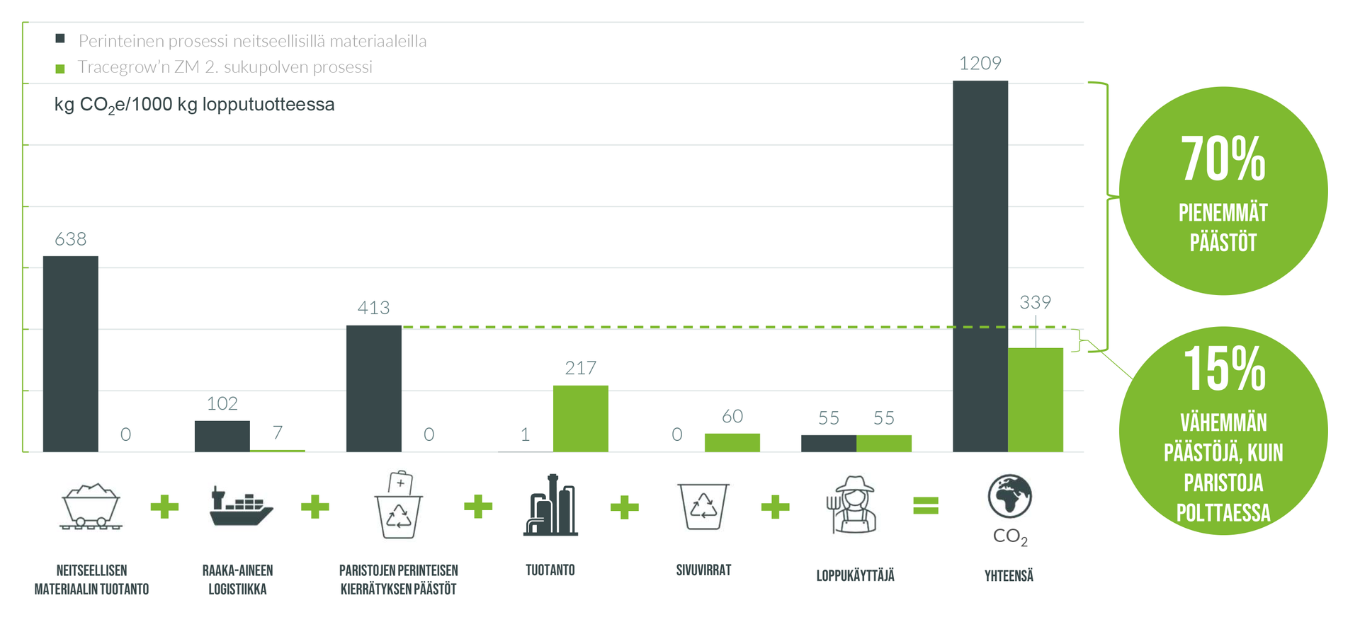 Elinkaarianalyysi paljastaa miksi prosessissamme syntyy merkittävästi vähemmän päästöjä perinteiseen prosessiin nähden. Omassa arvoketjussamme emme ole riippuvaisia alkuaineiden louhinnasta ja raaka-aineiden pitkistä kuljetusmatkoista. Prosessimme etu on myös se, että tuotamme materiaaleja alueellisesti, ja näin logistiikan aiheuttamat päästöt vähenevät merkittävästi. Päästömme muodostuvat pääosin tuotantolaitoksessamme, kun käsittelemme kierrätyspohjaisia raaka-aineitamme RETRACE-prosessillamme.